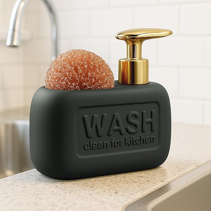 • Design: The dispenser has an integrated compartment to hold a sponge or scrubber, helping to keep the sink area organized.